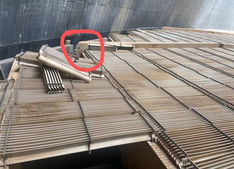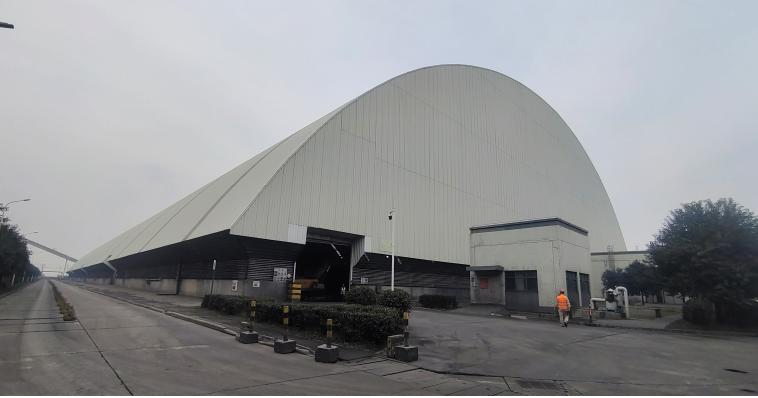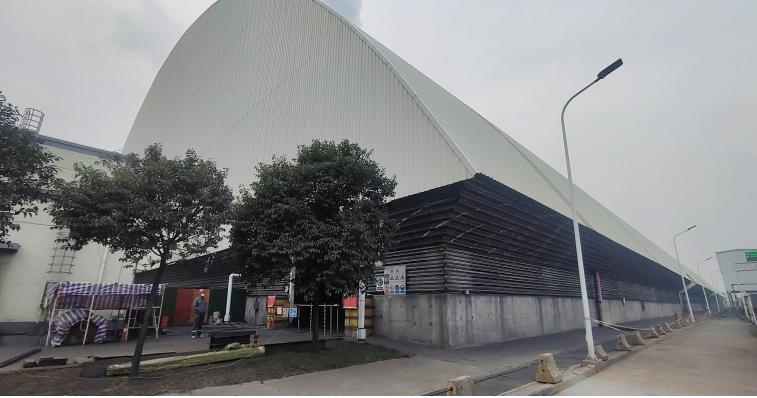 本工程于2024年實(shí)施,項(xiàng)目位于河南省鄭州市鞏義市大唐鞏義電廠內(nèi),原干煤棚結(jié)構(gòu)形式為鋼網(wǎng)架,網(wǎng)架縱向柱網(wǎng)8m,縱向總長為284m,在居中位置設(shè)置結(jié)構(gòu)縫,橫向跨度120m,總占地面積約35385m2,網(wǎng)架內(nèi)凈空最大高度約36.85m,總高度約40.25m。干煤棚于2016年建設(shè)投產(chǎn),期間一直作為干煤儲(chǔ)煤棚,由于北側(cè)的基礎(chǔ)發(fā)生不均勻的沉降,導(dǎo)致部分支座沉降,其中29/K軸支座最大沉降量達(dá)到100mm,帶動(dòng)網(wǎng)架支座也發(fā)生沉降,造成上部網(wǎng)架部分桿件發(fā)生彎曲變形,存在安全隱患。