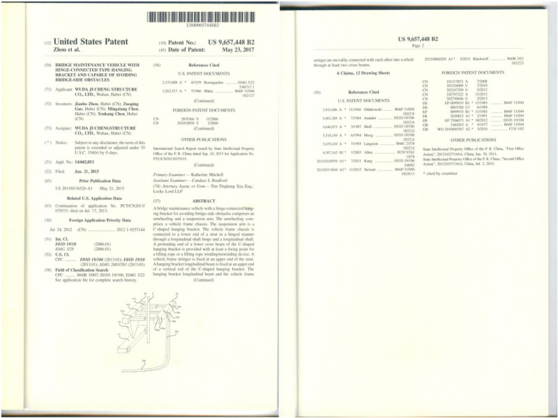 熱烈祝賀我公司不封道橋梁檢修架車發(fā)明專利獲美國(guó)授權(quán)。該專利于2013年通過PCT分別進(jìn)入美國(guó)和歐洲進(jìn)行專利申請(qǐng),并于今年獲得美國(guó)授權(quán)。據(jù)悉,在歐洲的專利申請(qǐng)也進(jìn)行到后期答復(fù)階段,相信不久將傳來捷報(bào)。