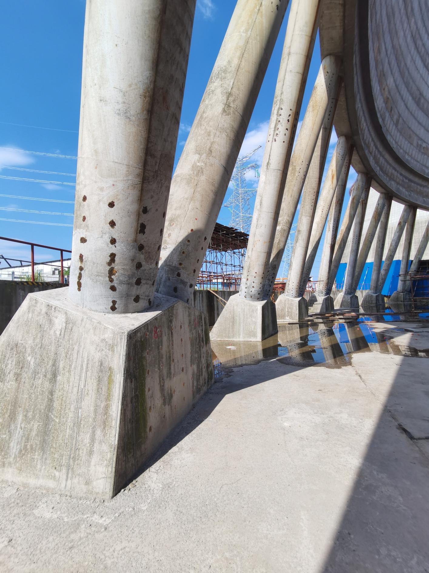 豐城電廠7#冷卻塔因發(fā)生過特大安全生產(chǎn)事故,為各方所關(guān)注。2020年復(fù)工后,巨成結(jié)構(gòu)憑借過硬的技術(shù)實(shí)力,榮譽(yù)承接了冷卻塔筒壁設(shè)計(jì)與加固工程。該工程屬于高危項(xiàng)目,開工前,巨成結(jié)構(gòu)的設(shè)計(jì)方案和施工組織設(shè)計(jì)均通過了專家論證。其中采用的多項(xiàng)巨成專有技術(shù)也得到了各位專家的認(rèn)可,如:擴(kuò)孔自鎖錨固技術(shù)保證新舊混凝土緊密結(jié)合、補(bǔ)償收縮細(xì)石混凝土保證施工質(zhì)量、便攜式鋼平臺保證施工安全、曲線施工升降機(jī)保證垂直運(yùn)輸。