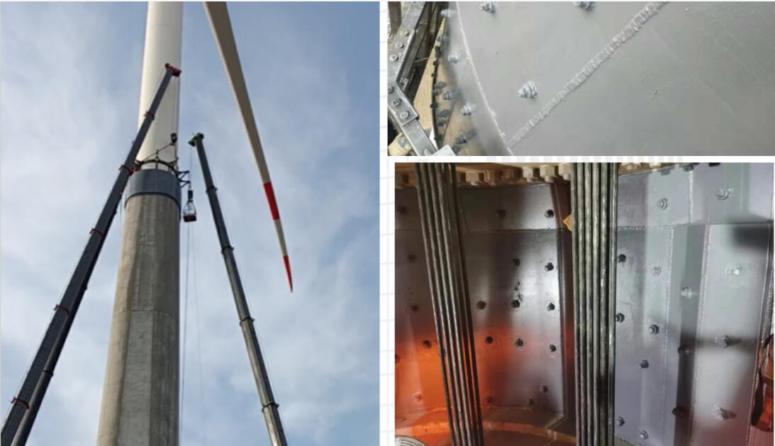鄄城?電場項?38號、40號機位塔?140m,由4段預制塔段、轉(zhuǎn)接段、鋼塔段組成,搭載海裝2.5MW葉輪直徑140m?電機組,于2020年11?安裝結(jié)束。2020年10?檢修?員發(fā)現(xiàn)鄄城項?38號、40號機位塔筒轉(zhuǎn)接環(huán)內(nèi)側(cè)區(qū)域出現(xiàn)裂縫及混凝?崩裂現(xiàn)象,外側(cè)區(qū)域嚴重受損,出現(xiàn)混凝???積脫落現(xiàn)象,同時C4段構(gòu)件亦存在不同程度裂縫及混凝?崩裂脫落。本次受委托?要求僅對受損的轉(zhuǎn)接段和第四段塔筒病害進?修復和補強處理。處理?案為:對轉(zhuǎn)接段內(nèi)外側(cè)外包鋼板并在鋼板與混凝?結(jié)構(gòu)形成的空腔中澆筑?強灌漿料,采?JCZ-MG-20擴孔?鎖錨桿植?原結(jié)構(gòu)與內(nèi)、外側(cè)加固鋼板連接。