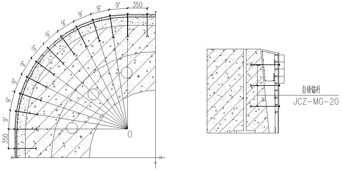 采?混凝?缺陷修補及?鎖錨桿進?加固,?鎖錨桿穿過結(jié)合?,在分層處將兩部分連成整體。根據(jù)計算結(jié)果,基礎靠近臺柱的內(nèi)圈部分應?較?,其他區(qū)域則應?較?,因此錨桿的分布設計靠近臺柱的內(nèi)圈部分較密,?外圈其他區(qū)域則較疏。