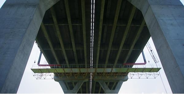 本工程于2007年施工。荊州長(zhǎng)江公路大橋1998年3月開建,2002年10月通車,雙塔斜拉橋,主橋段長(zhǎng)4178米。經(jīng)過多年運(yùn)行出現(xiàn)一些病害,巨成2017年承接橋梁維護(hù)工程,主要施工內(nèi)容為裂縫處理、支座更換、缺陷修補(bǔ)等。應(yīng)用巨成不封道橋梁檢修架車,不影響交通的情況下完成施工任務(wù),社會(huì)經(jīng)濟(jì)價(jià)值顯著。