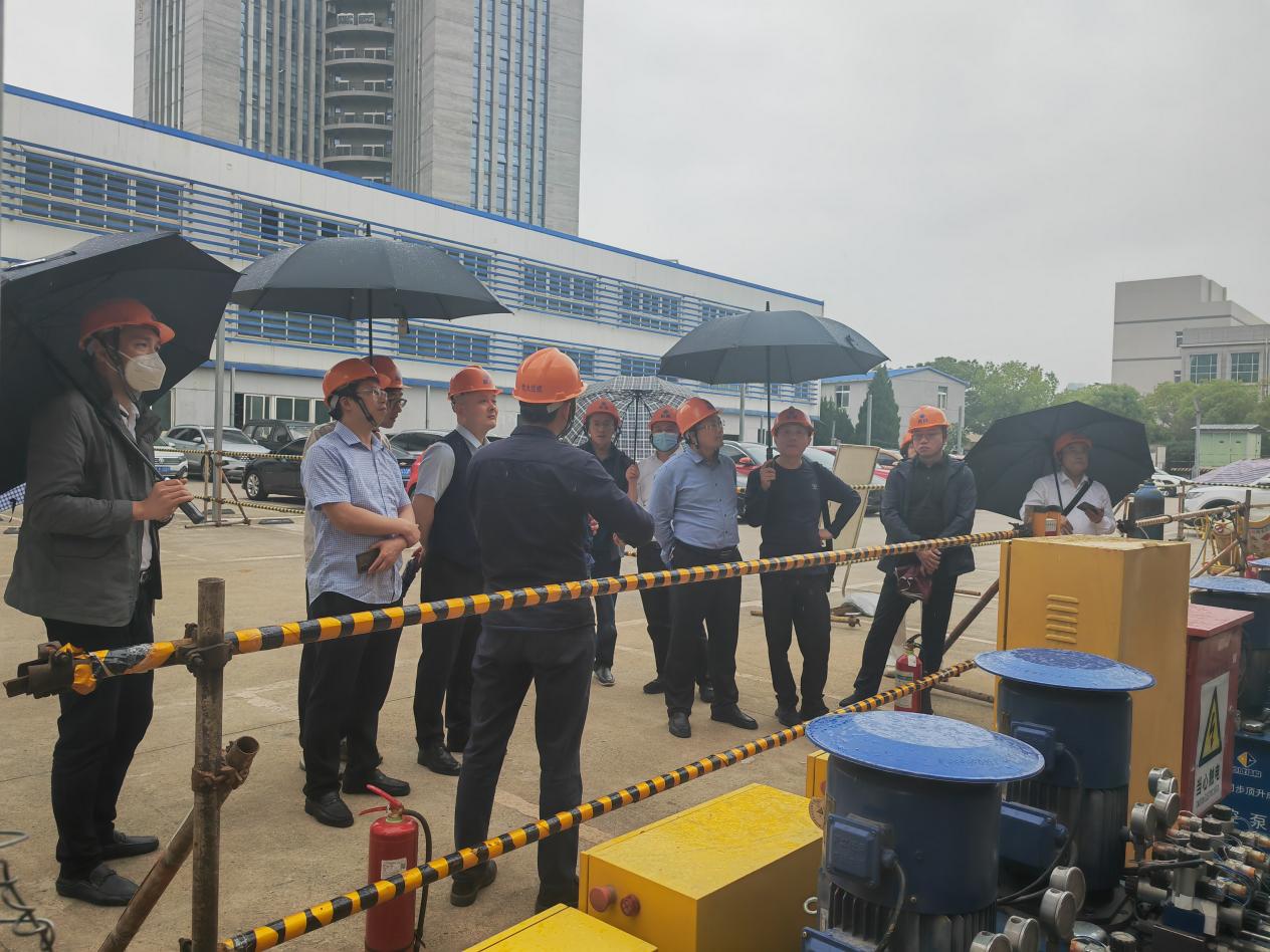 在巨成鋼滑道群控同步頂升工程試驗項目現(xiàn)場,研究院院長助理周志勇對鋼滑道群控同步頂升試驗的背景和目的進行了介紹,對該技術(shù)的安全性、高效性、經(jīng)濟性等特點進行說明,雙方在應用場景方面進行了探討和交流。