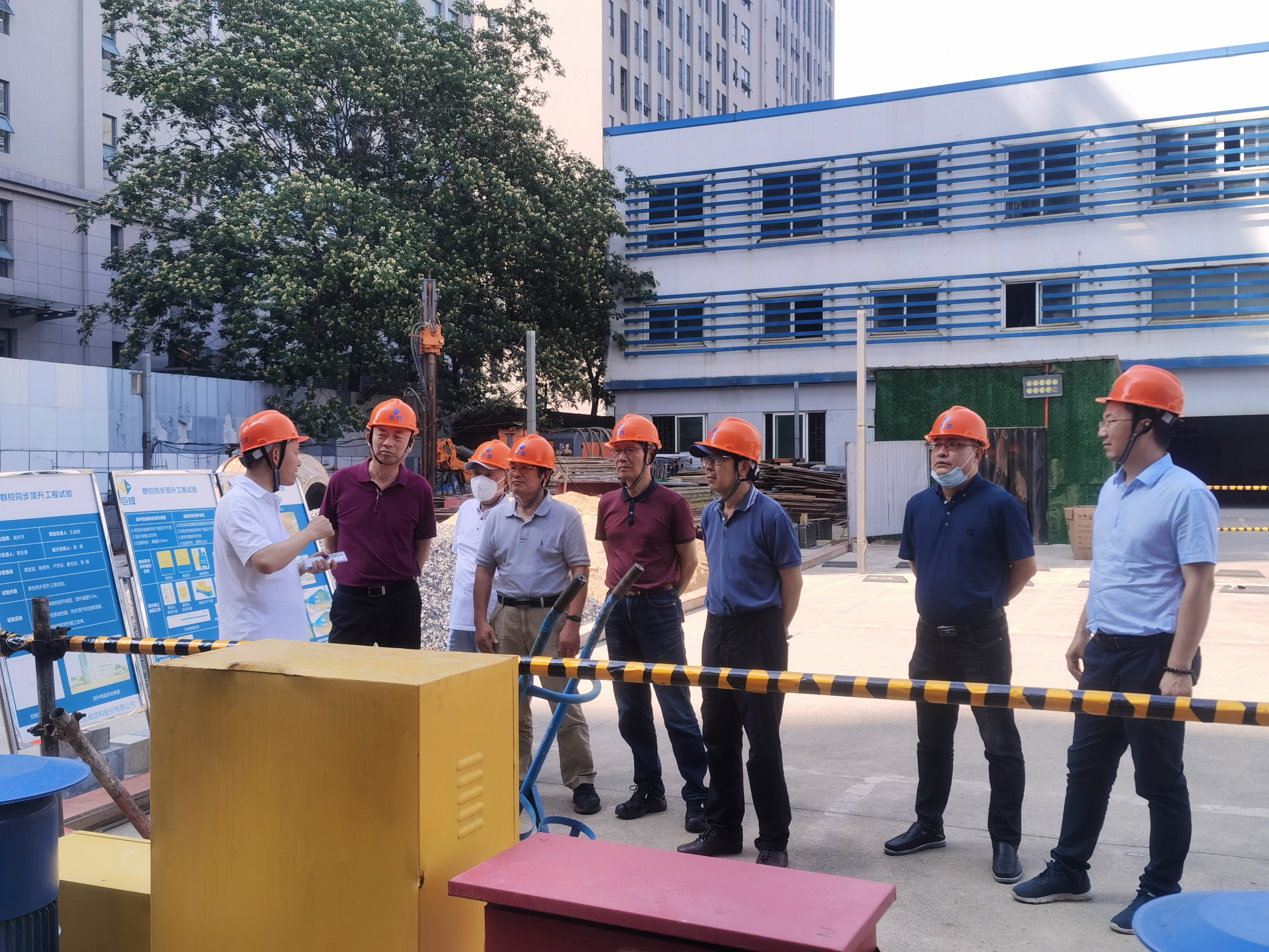 考察團一行來到巨成群控同步頂升工程試驗項目現(xiàn)場,巨成研究院院長助理周志勇介紹了頂升試驗的背景、目的和群控同步頂升大型數(shù)控設(shè)備以及頂升應(yīng)用前景。雙方對鋼滑道頂升技術(shù)和應(yīng)用場景展開了深入的討論和交流,大家一致認為巨成群控同步頂升技術(shù)能夠在城市更新、老舊小區(qū)改造、濱海建筑物等領(lǐng)域發(fā)揮重大作用。