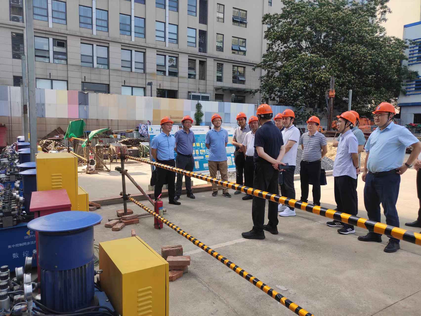 陳總一行首先考察了巨成群控同步頂升工程試驗(yàn)項(xiàng)目現(xiàn)場(chǎng),副總經(jīng)理張暢介紹了頂升試驗(yàn)的背景、目的和群控同步頂升大型數(shù)控設(shè)備以及頂升應(yīng)用前景。雙方對(duì)鋼滑道頂升技術(shù)和應(yīng)用場(chǎng)景展開了深入的討論和交流,大家一致認(rèn)為巨成群控同步頂升技術(shù)能夠在城市更新、老舊小區(qū)改造以及橋梁頂升等領(lǐng)域發(fā)揮重大作用。