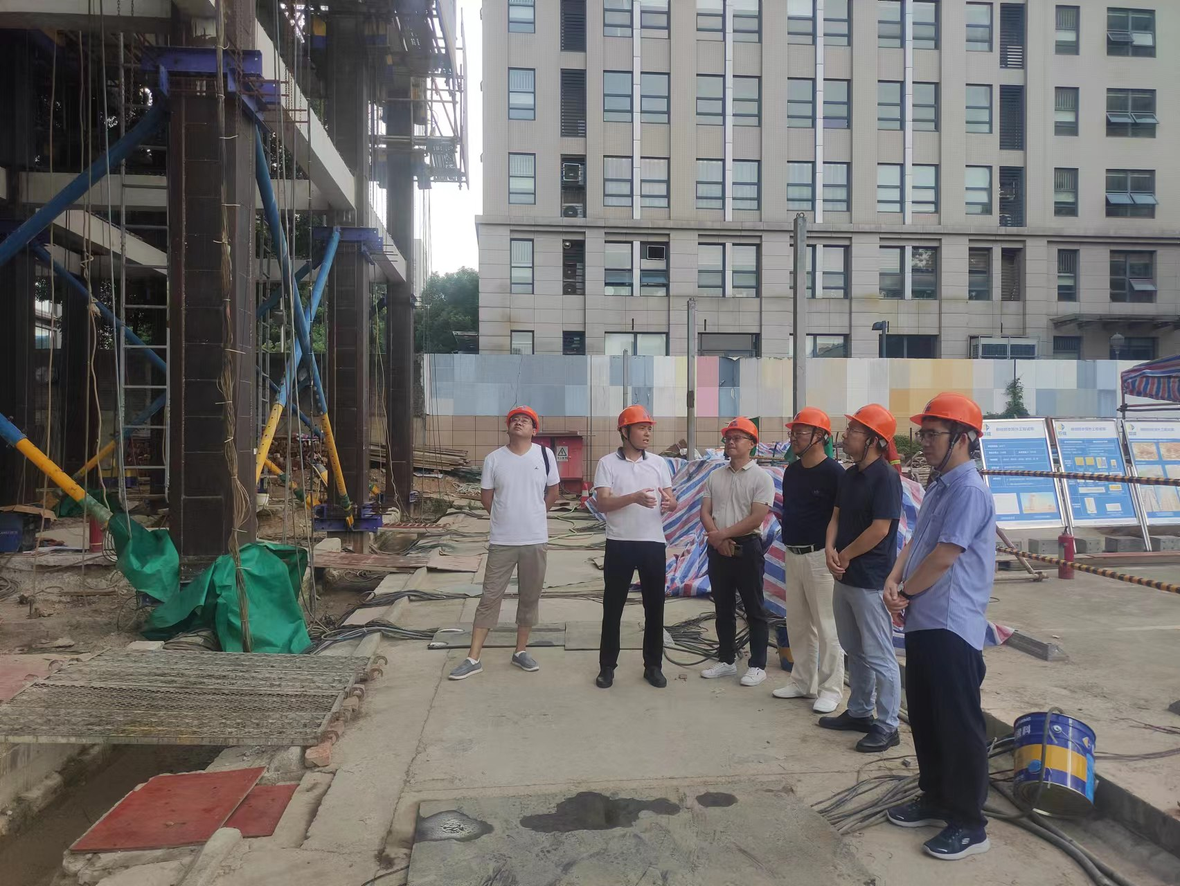 雷院長一行參觀了巨成群控同步頂升工程試驗項目現(xiàn)場,巨成研究院院長助理周志勇介紹了試驗詳情。雙方對鋼滑道頂升技術和應用場景展開了深入的討論和交流,大家一致認為巨成群控同步頂升技術能夠在老舊小區(qū)改造等領域發(fā)揮重大作用,特別是在老舊小區(qū)停車難的問題上能夠有實質性的解決方案。