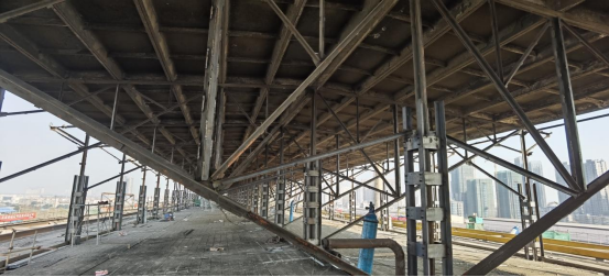 獲獎代表周志勇,現(xiàn)在正在四川德陽中國二重裝備集團(tuán)鑄鍛公司車間改造項目現(xiàn)場,介紹了二重項目巨成科技的創(chuàng)新應(yīng)用。該廠房開展環(huán)保改造,主要內(nèi)容包括屋面板更換、天窗架降低高度等。但由于該廠房規(guī)模大(308m×82m×35m),且周邊均建有相關(guān)建筑,屋面板無法采用吊車拆除和更換,天窗架更是不能采用吊車開展拆除和新建,巨成公司應(yīng)用兩個創(chuàng)新技術(shù)將其完美解決,并大大降低了成本、節(jié)約了工期。其一,是研發(fā)了大型工業(yè)廠房屋面板軌道拆裝成套設(shè)備,對大屋面和天窗架上的屋面板進(jìn)行拆裝。其二,是利用鋼滑道頂升技術(shù)對天窗架實施整體頂降,天窗架長228m、寬18m、高5.45m,我們在35m高度的屋面上對其進(jìn)行同步頂降施工,將天窗架整體下降1.945m,目前已經(jīng)完成了天窗架頂降的各項準(zhǔn)備工作,計劃于12月30日正式頂降。這是國內(nèi)外大型工業(yè)廠房天窗架整體頂降的首例工程。