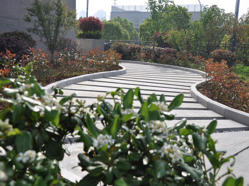 本次景觀小徑的設計師方俊介紹道,景觀小路的設計主要遵循了和諧原則和韻律原則。首先,因公司園內屬于廠房規(guī)劃,整體格調為整齊、規(guī)正。在選擇步道形態(tài)時,采用富有趣味性的曲線,并在分割縫中填上白色圓石,讓行人在踏步的過程中感受到整體板塊所不能賦予的韻律感。其次,因步道為內部員工就餐回園區(qū)的主要路線,會三五成群返回工作區(qū)域,設計寬度為2.5米,可供5人并行。最后,為了使步道能夠與巨成大廈融為一體,因而選用了和大樓同一色系的清水混凝土涂裝。