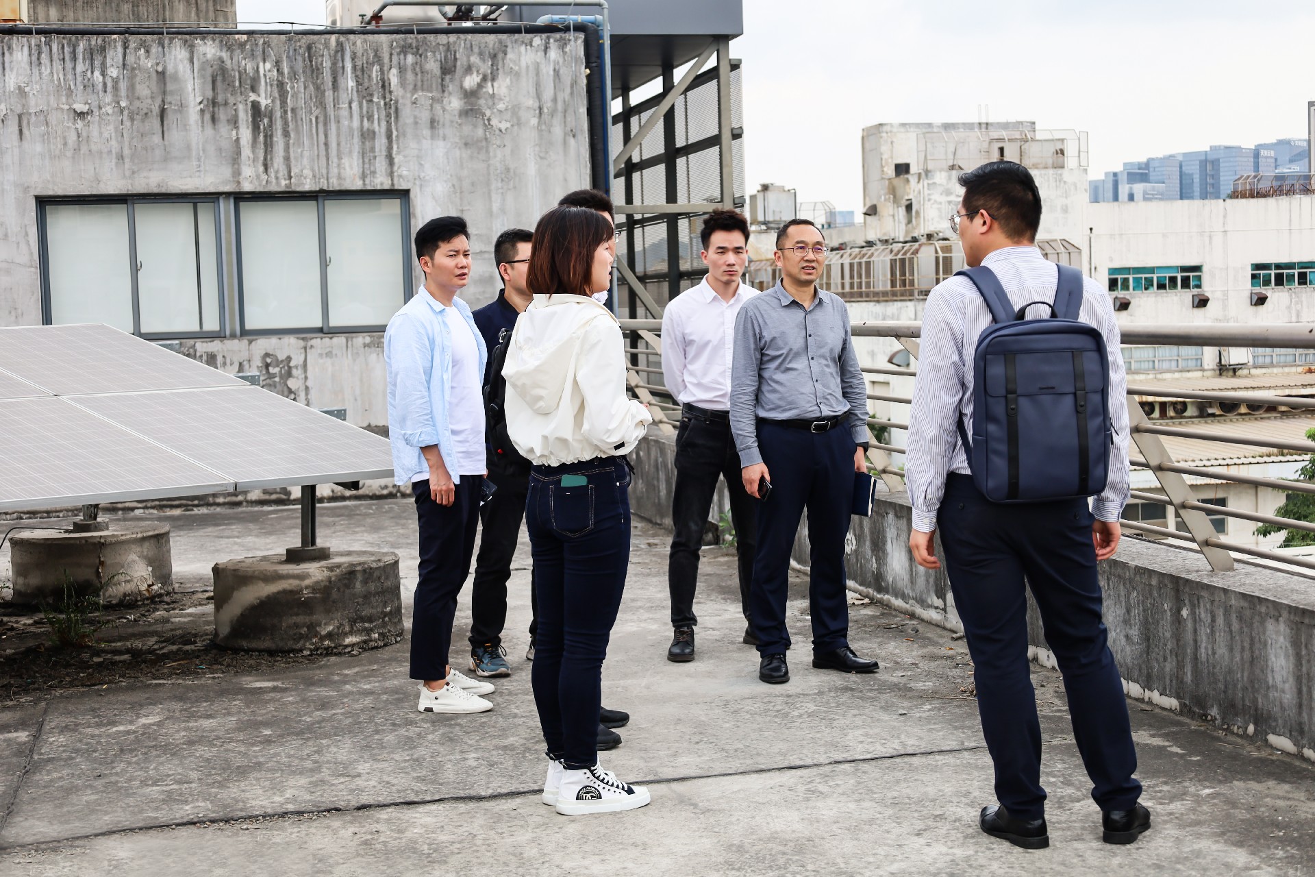 在園區(qū)光伏項目現(xiàn)場,技術(shù)人員為來訪嘉賓講解了該項目的規(guī)模、作用原理及節(jié)能降碳成效。