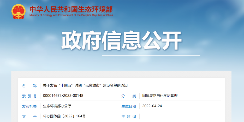 5、生態(tài)環(huán)境部:關(guān)于發(fā)布“十四五”時期“無廢城市”建設(shè)名單的通知