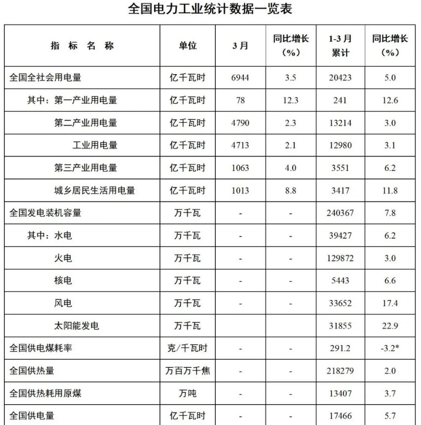 2、國家能源局發(fā)布1-3月份全國電力工業(yè)統(tǒng)計數(shù)據(jù)